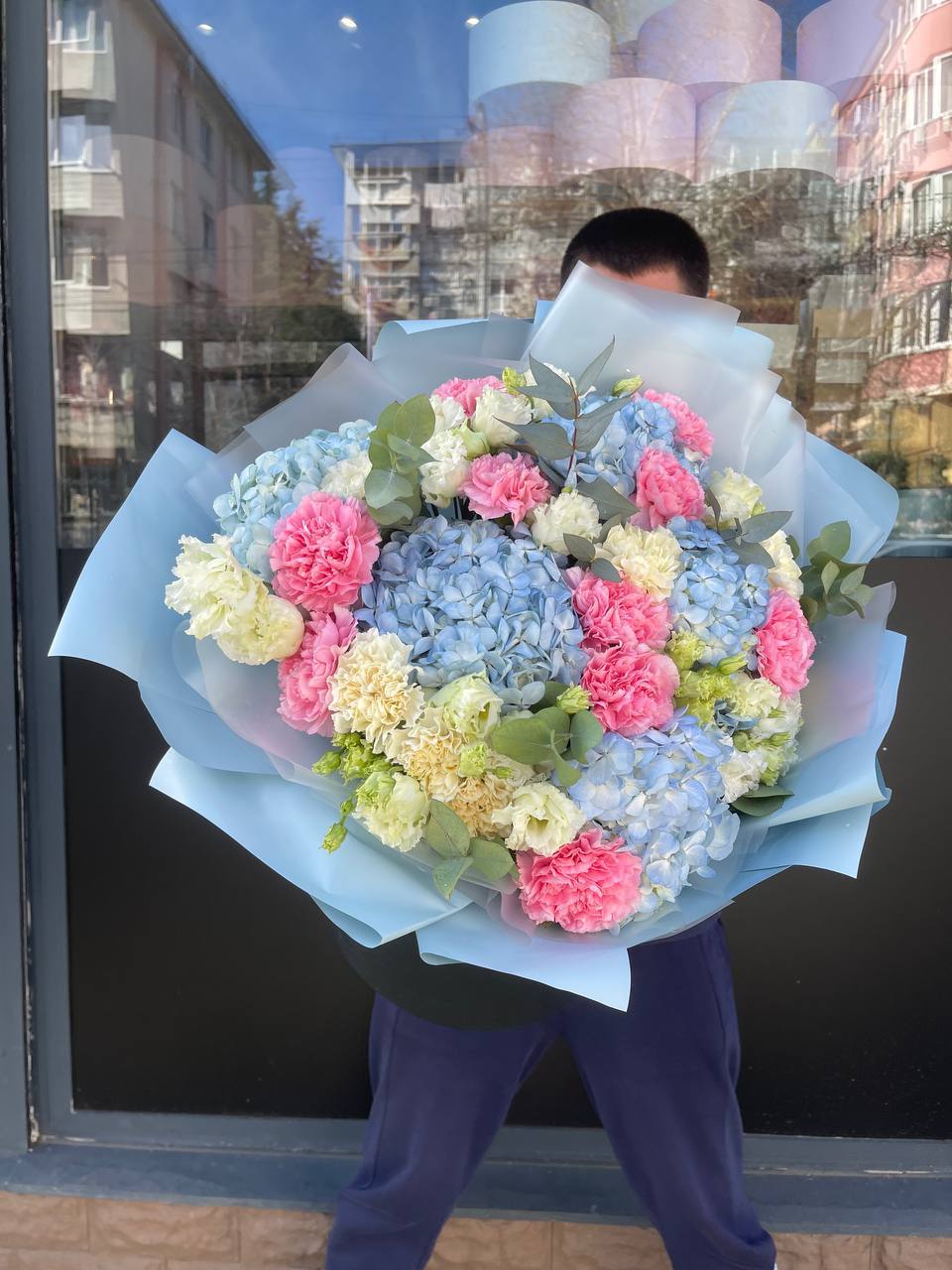 гортензия, эустома, диантус, эвкалипт, пленка.
