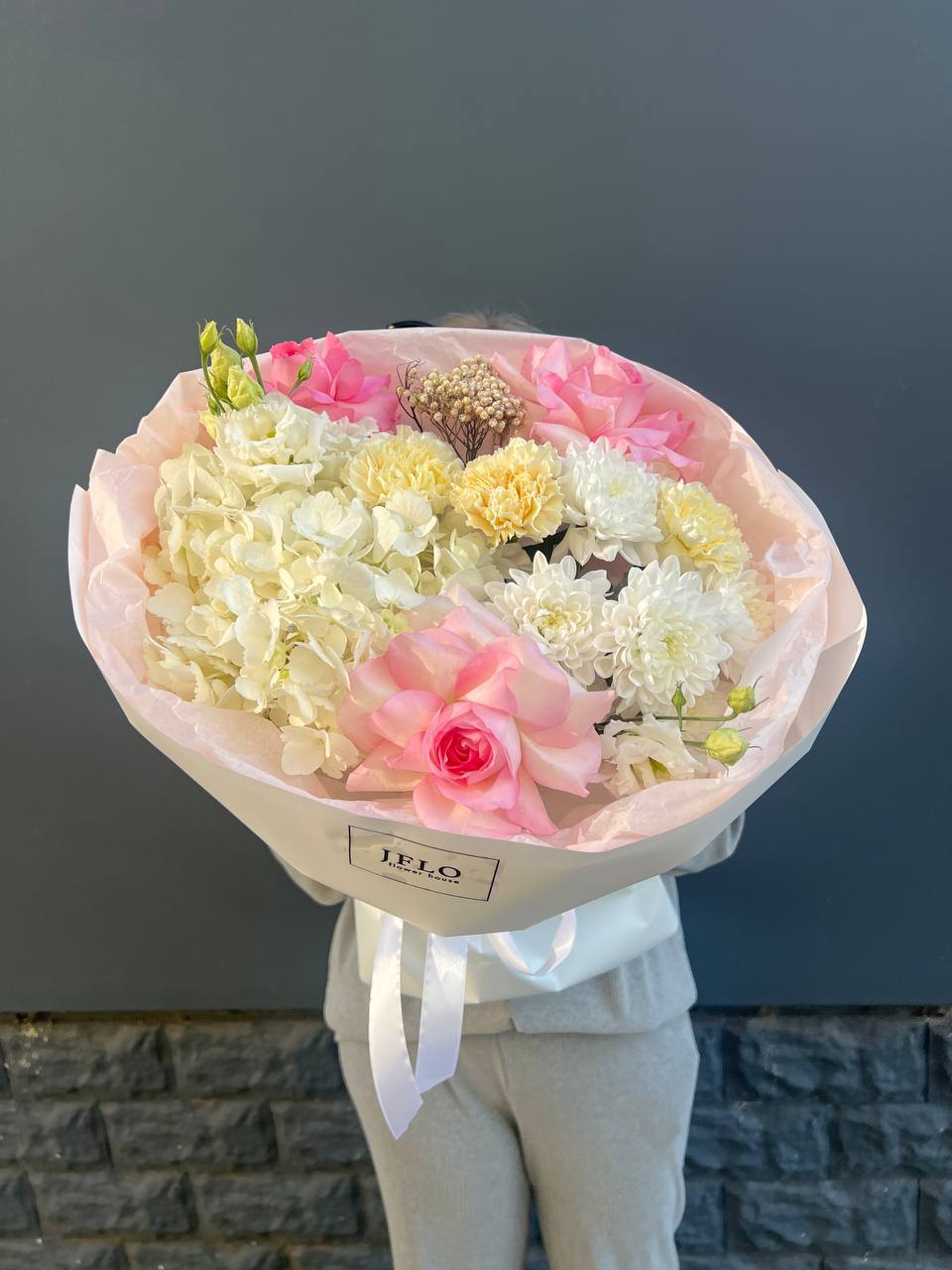 Этот пышный и по-настоящему масштабный букет — идеальный пример авторской флористики, где объем сочетается с невероятной нежностью.